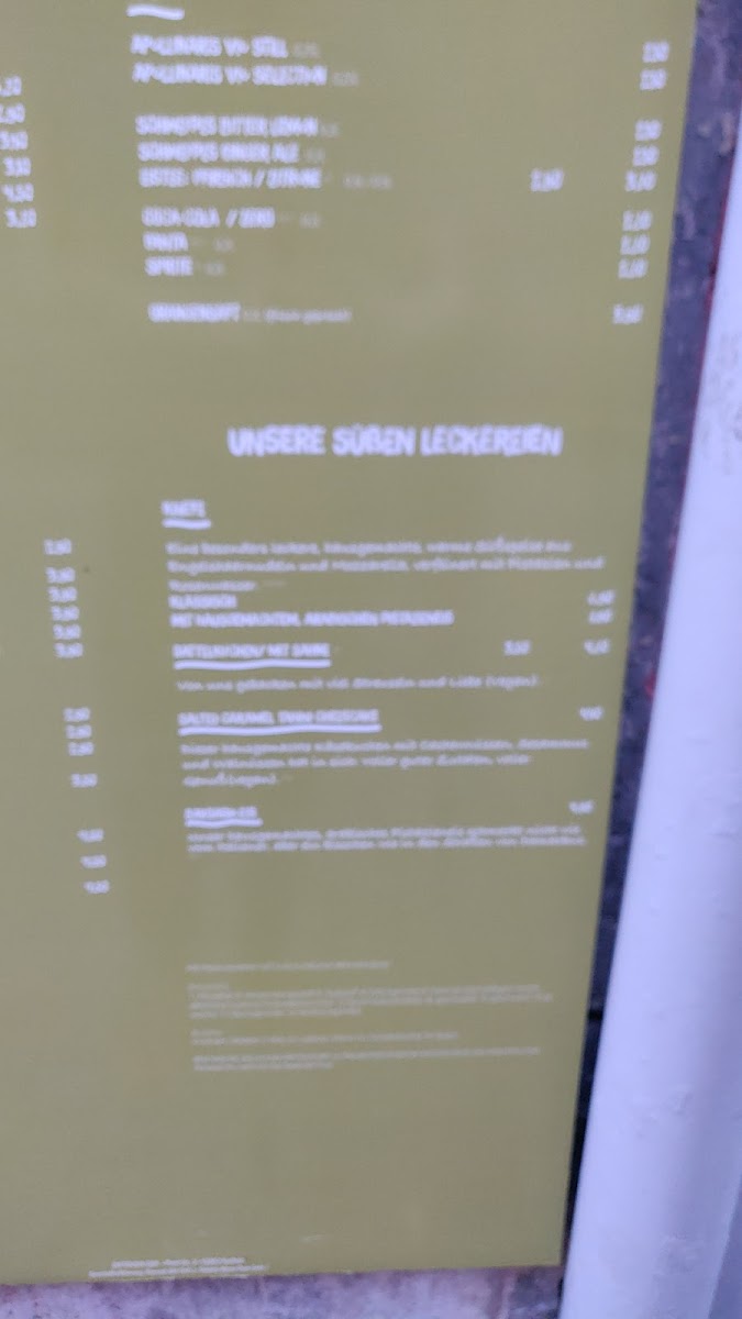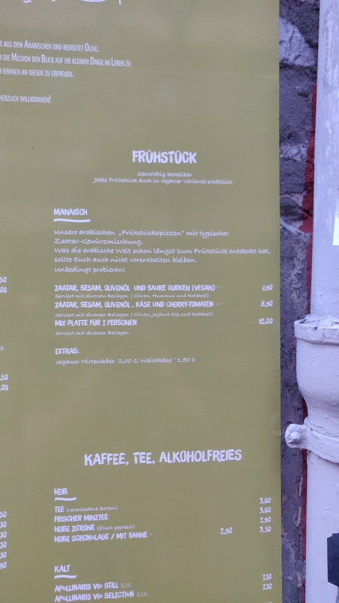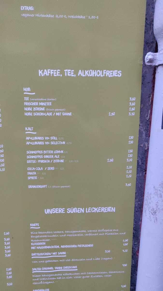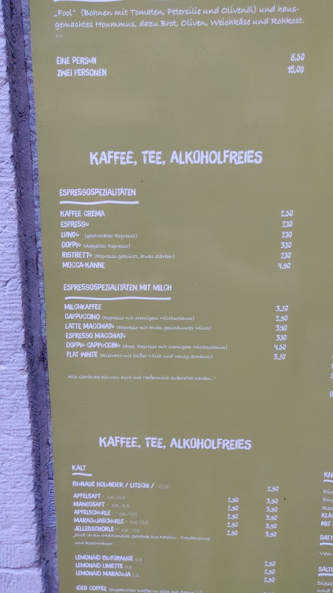 - Hot Beverages: A selection of coffee drinks, including flat white, doppio cappuccino, milchkaffee, and vegan options like oat milk cappuccino, as well as different types of tea such as fresh mint tea and lemon tea with honey.